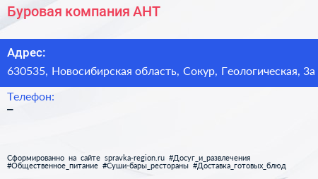 Буровая компания АНТ по адресу 630535, Новосибирская область, Сокур, Геологическая, 3а в дальнейшем Организация, размещена в следующих категориях: