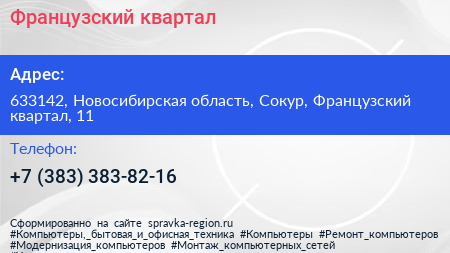 Французский квартал по адресу 633142, Новосибирская область, Сокур, Французский квартал, 11 в дальнейшем Организация, размещена в следующих категориях: