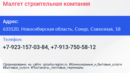 Малгет, строительная компания по адресу 633120, Новосибирская область, Сокур, Совхозная, 18 в дальнейшем Организация, размещена в следующих категориях: