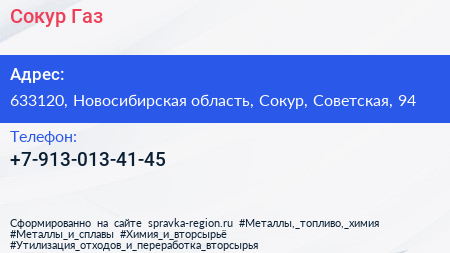 Сокур-Газ по адресу 633120, Новосибирская область, Сокур, Советская, 94 в дальнейшем Организация, размещена в следующих категориях: