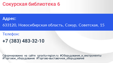 Сокурская библиотека №6 по адресу 633120, Новосибирская область, Сокур, Советская, 15 в дальнейшем Организация, размещена в следующих категориях: