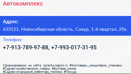 Автокомплекс по адресу 633121, Новосибирская область, Сокур, 1-й квартал, 29а в дальнейшем Организация, размещена в следующих категориях: