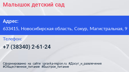 Малышок, детский сад по адресу 633415, Новосибирская область, Сокур, Магистральная, 9 в дальнейшем Организация, размещена в следующих категориях: