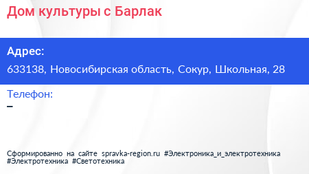 Дом культуры, с. Барлак по адресу 633138, Новосибирская область, Сокур, Школьная, 28 в дальнейшем Организация, размещена в следующих категориях: