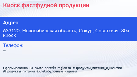 Киоск фастфудной продукции по адресу 633120, Новосибирская область, Сокур, Советская, 80а киоск в дальнейшем Организация, размещена в следующих категориях: