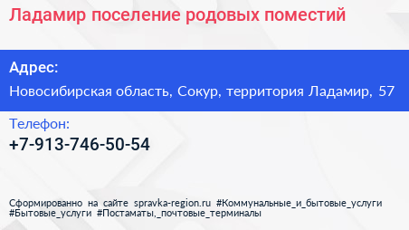 Ладамир, поселение родовых поместий по адресу Новосибирская область, Сокур, территория Ладамир, 57 в дальнейшем Организация, размещена в следующих категориях: