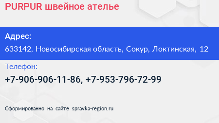 PURPUR, швейное ателье по адресу 633142, Новосибирская область, Сокур, Локтинская, 12 в дальнейшем Организация, размещена в следующих категориях: