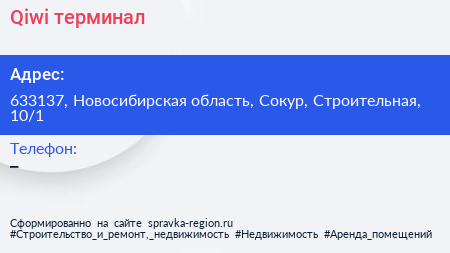 Qiwi, терминал по адресу 633137, Новосибирская область, Сокур, Строительная, 10/1 в дальнейшем Организация, размещена в следующих категориях: