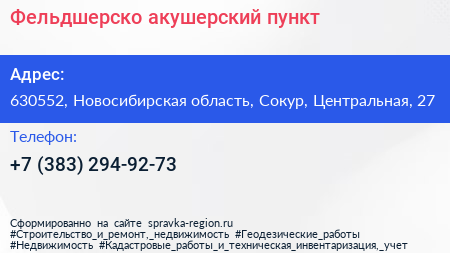 Фельдшерско-акушерский пункт по адресу 630552, Новосибирская область, Сокур, Центральная, 27 в дальнейшем Организация, размещена в следующих категориях: