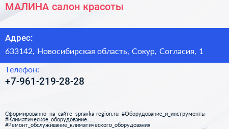 МАЛИНА, салон красоты по адресу 633142, Новосибирская область, Сокур, Согласия, 1 в дальнейшем Организация, размещена в следующих категориях: