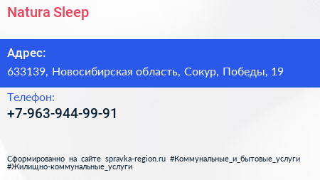 Natura Sleep по адресу 633139, Новосибирская область, Сокур, Победы, 19 в дальнейшем Организация, размещена в следующих категориях: