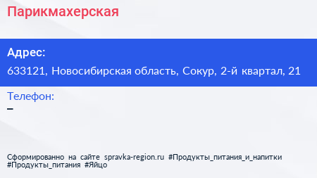 Парикмахерская по адресу 633121, Новосибирская область, Сокур, 2-й квартал, 21 в дальнейшем Организация, размещена в следующих категориях: