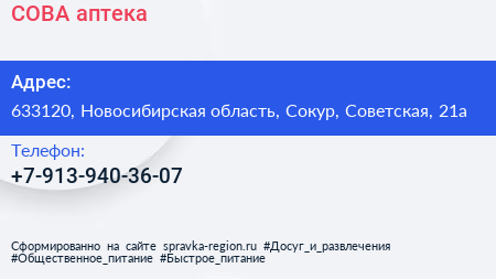 СОВА, аптека по адресу 633120, Новосибирская область, Сокур, Советская, 21а в дальнейшем Организация, размещена в следующих категориях: