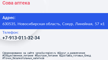 Сова, аптека по адресу 630535, Новосибирская область, Сокур, Линейная, 57 к1 в дальнейшем Организация, размещена в следующих категориях: