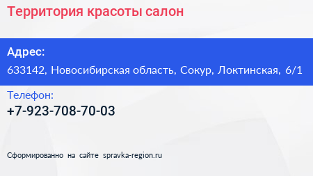 Территория красоты, салон по адресу 633142, Новосибирская область, Сокур, Локтинская, 6/1 в дальнейшем Организация, размещена в следующих категориях: