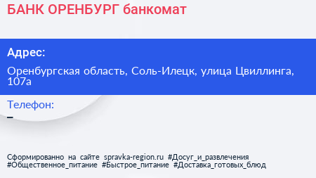БАНК ОРЕНБУРГ, банкомат по адресу Оренбургская область, Соль-Илецк, улица Цвиллинга, 107а в дальнейшем Организация, размещена в следующих категориях: