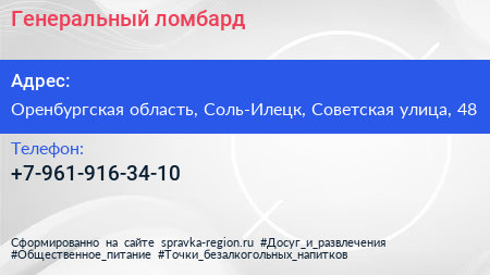Генеральный ломбард по адресу Оренбургская область, Соль-Илецк, Советская улица, 48 в дальнейшем Организация, размещена в следующих категориях: