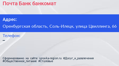 Почта Банк, банкомат по адресу Оренбургская область, Соль-Илецк, улица Цвиллинга, 66 в дальнейшем Организация, размещена в следующих категориях: