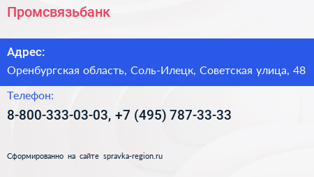 Промсвязьбанк по адресу Оренбургская область, Соль-Илецк, Советская улица, 48 в дальнейшем Организация, размещена в следующих категориях: