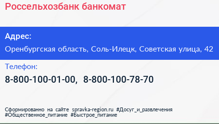 Россельхозбанк, банкомат по адресу Оренбургская область, Соль-Илецк, Советская улица, 42 в дальнейшем Организация, размещена в следующих категориях: