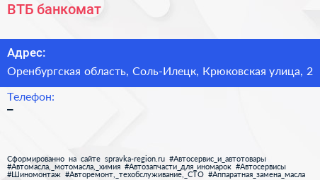 ВТБ, банкомат по адресу Оренбургская область, Соль-Илецк, Крюковская улица, 2 в дальнейшем Организация, размещена в следующих категориях: