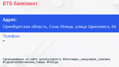 ВТБ, банкомат по адресу Оренбургская область, Соль-Илецк, улица Цвиллинга, 66 в дальнейшем Организация, размещена в следующих категориях: