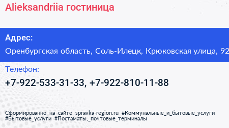 Alieksandriia, гостиница по адресу Оренбургская область, Соль-Илецк, Крюковская улица, 92 в дальнейшем Организация, размещена в следующих категориях: