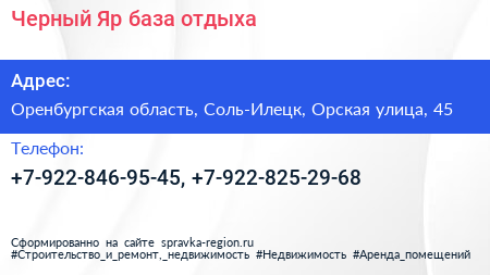 Черный Яр, база отдыха по адресу Оренбургская область, Соль-Илецк, Орская улица, 45 в дальнейшем Организация, размещена в следующих категориях: