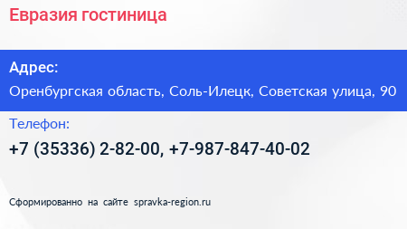 Евразия, гостиница по адресу Оренбургская область, Соль-Илецк, Советская улица, 90 в дальнейшем Организация, размещена в следующих категориях:
