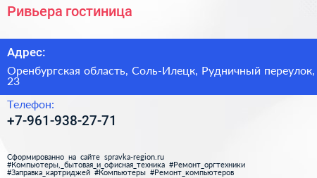 Ривьера, гостиница по адресу Оренбургская область, Соль-Илецк, Рудничный переулок, 23 в дальнейшем Организация, размещена в следующих категориях: