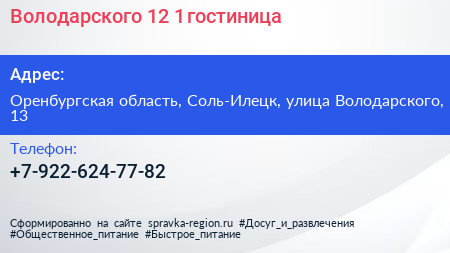 Володарского 12+1, гостиница по адресу Оренбургская область, Соль-Илецк, улица Володарского, 13 в дальнейшем Организация, размещена в следующих категориях: