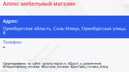 Алекс, мебельный магазин по адресу Оренбургская область, Соль-Илецк, Оренбургская улица, 8 в дальнейшем Организация, размещена в следующих категориях: