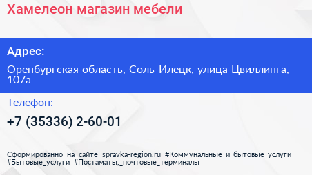 Хамелеон, магазин мебели по адресу Оренбургская область, Соль-Илецк, улица Цвиллинга, 107а в дальнейшем Организация, размещена в следующих категориях: