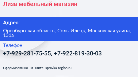 Лиза, мебельный магазин по адресу Оренбургская область, Соль-Илецк, Московская улица, 131а в дальнейшем Организация, размещена в следующих категориях: