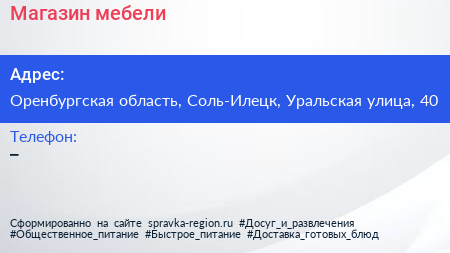 Магазин мебели по адресу Оренбургская область, Соль-Илецк, Уральская улица, 40 в дальнейшем Организация, размещена в следующих категориях:
