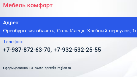 Мебель комфорт по адресу Оренбургская область, Соль-Илецк, Хлебный переулок, 1г в дальнейшем Организация, размещена в следующих категориях: