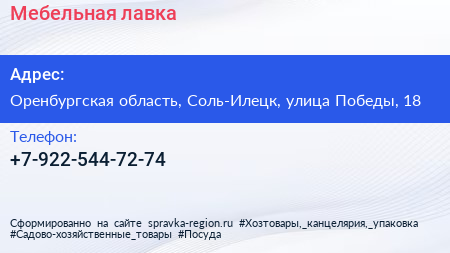 Мебельная лавка по адресу Оренбургская область, Соль-Илецк, улица Победы, 18 в дальнейшем Организация, размещена в следующих категориях: