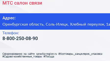 МТС, салон связи по адресу Оренбургская область, Соль-Илецк, Хлебный переулок, 1а в дальнейшем Организация, размещена в следующих категориях: