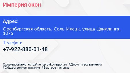 Империя окон по адресу Оренбургская область, Соль-Илецк, улица Цвиллинга, 107а в дальнейшем Организация, размещена в следующих категориях: