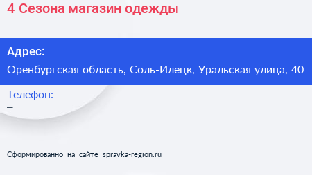 4 Сезона, магазин одежды по адресу Оренбургская область, Соль-Илецк, Уральская улица, 40 в дальнейшем Организация, размещена в следующих категориях: