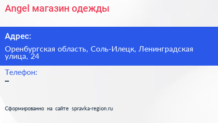 Angel, магазин одежды по адресу Оренбургская область, Соль-Илецк, Ленинградская улица, 24 в дальнейшем Организация, размещена в следующих категориях: