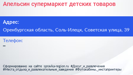 Апельсин, супермаркет детских товаров по адресу Оренбургская область, Соль-Илецк, Советская улица, 39 в дальнейшем Организация, размещена в следующих категориях:
