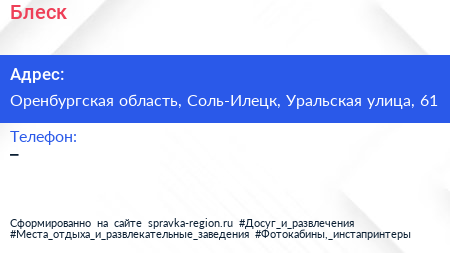 Блеск по адресу Оренбургская область, Соль-Илецк, Уральская улица, 61 в дальнейшем Организация, размещена в следующих категориях: