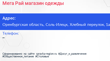 Мега Рай, магазин одежды по адресу Оренбургская область, Соль-Илецк, Хлебный переулок, 1а в дальнейшем Организация, размещена в следующих категориях: