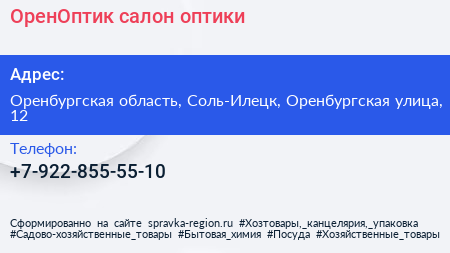 ОренОптик, салон оптики по адресу Оренбургская область, Соль-Илецк, Оренбургская улица, 12 в дальнейшем Организация, размещена в следующих категориях:
