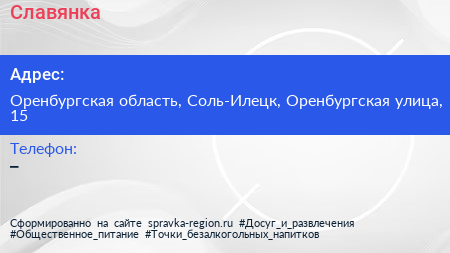 Славянка по адресу Оренбургская область, Соль-Илецк, Оренбургская улица, 15 в дальнейшем Организация, размещена в следующих категориях: