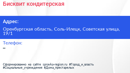 Бисквит, кондитерская по адресу Оренбургская область, Соль-Илецк, Советская улица, 19/1 в дальнейшем Организация, размещена в следующих категориях:
