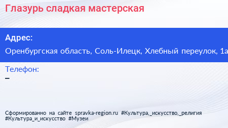 Глазурь, сладкая мастерская по адресу Оренбургская область, Соль-Илецк, Хлебный переулок, 1а в дальнейшем Организация, размещена в следующих категориях: