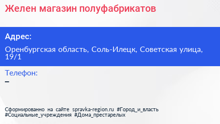 Желен, магазин полуфабрикатов по адресу Оренбургская область, Соль-Илецк, Советская улица, 19/1 в дальнейшем Организация, размещена в следующих категориях: