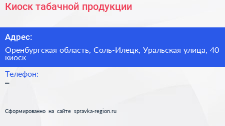 Киоск табачной продукции по адресу Оренбургская область, Соль-Илецк, Уральская улица, 40 киоск в дальнейшем Организация, размещена в следующих категориях: